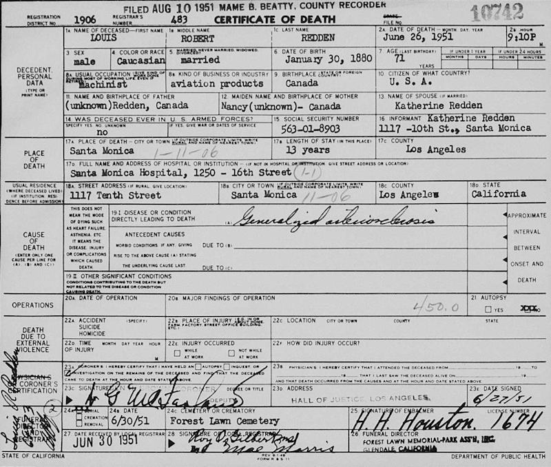 Birth Born on January 30, 1880 in Grand Pre, Kings Co., NS Death Died on June 26, 1951 in Santa Monica, Los Angeles Co., CA Buried in Forest Lawn Memorial Park in Glendale, Los Angeles Co., CA Marriages PHINNEY, Alice Married on July 17, 1901 in Somerville, Middlesex Co., MA Children REDDEN, Lillian Alice: April 02, 1902 - August 22, 1988 REDDEN, Lucille: 1907 Notes Occupation: Clerk/ Marble Cutter/ Machinist Death: Generalized Arteriosclerosis Sources California Deaths: Los Angeles Co. #10742 Images Louis Redden Louis Redden Death Alice Phinney Marriage