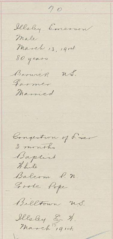 Parents Father: ILLSLEY, Nathan Mother: PORTER, Anna Birth Born on February 22, 1834 in Halls Harbour, Kings Co., NS Death Died on March 13, 1914 in Berwick, Kings Co., NS Buried in Billtown Baptist Cemetery in Billtown, Kings Co., NS Marriages FOOTE, Ruth Adelaide Children ILLSLEY, Embree W.: November 26, 1858 - June 11, 1938 ILLSLEY, Harmon: July 21, 1862 - February 19, 1937 Notes Occupation: Farmer Death: Congestion of Liver Sources Nova Scotia Deaths: Book 40 Pg. 17 #70 Images Emerson Illsley Emerson Illsley Death Emerson Illsley Emerson Illsley Death