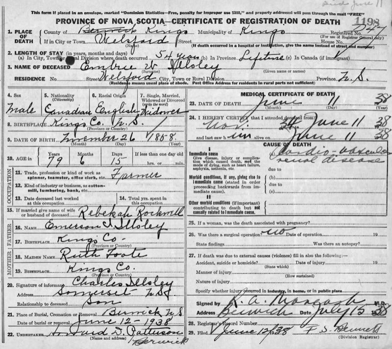 Parents Father: ILLSLEY, Emerson Nathan Mother: FOOTE, Ruth Adelaide Birth Born on November 26, 1858 in Kings Co., NS Death Died on June 11, 1938 in Welsford, Kings Co., NS Buried in Berwick Cemetery in Berwick, Kings Co., NS Marriages ROCKWELL, Rebecca Adelia Married on April 08, 1884 in Lakeville, Kings Co., NS Children ILLSLEY, Ruth Margaret: January 03, 1892 - November 27, 1954 Notes Occupation: Farmer Death: Cardio Vascular Renal Disease Sources Nova Scotia Deaths: Book 181 Pg. 1198 Images Embree & Rebecca (Rockwell) Illsley Embree Illsley Death