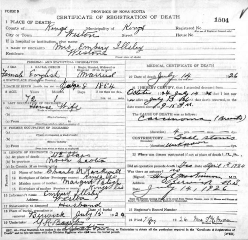 Birth Born on June 08, 1858 in Lakeville, Kings Co., NS Death Died on July 14, 1926 in Weston, Kings Co., NS Buried in Berwick Cemetery in Berwick, Kings Co., NS Marriages ILLSLEY, Embree W. Married on April 08, 1884 in Lakeville, Kings Co., NS Children ILLSLEY, Ruth Margaret: January 03, 1892 - November 27, 1954 Notes Death: Carcinoma of Breasts Sources Nova Scotia Deaths: Book 93 Pg. 1504 Images Embree & Rebecca (Rockwell) Illsley Rebecca (Rockwell) Illsley Death Embree Illsley Marriage