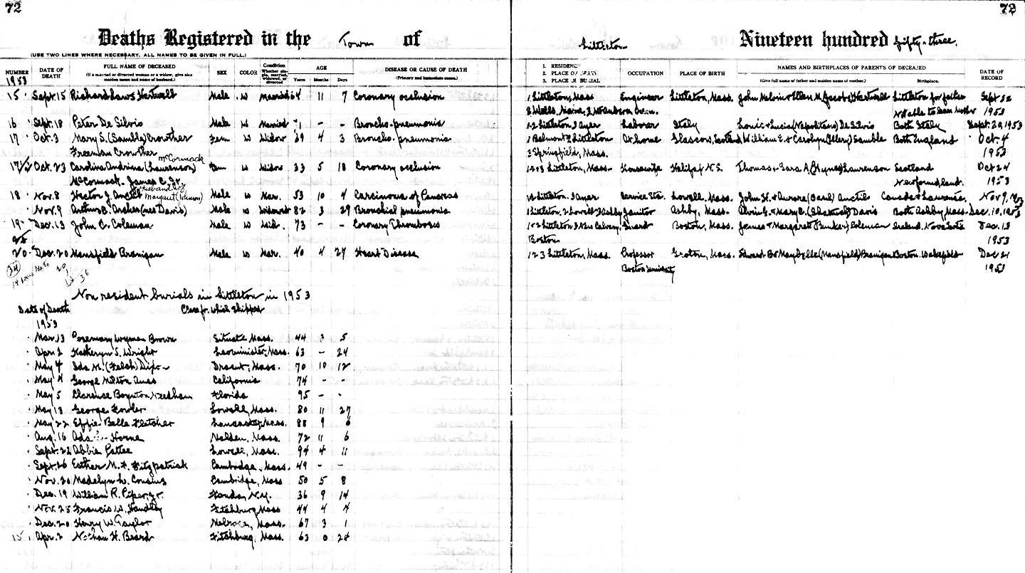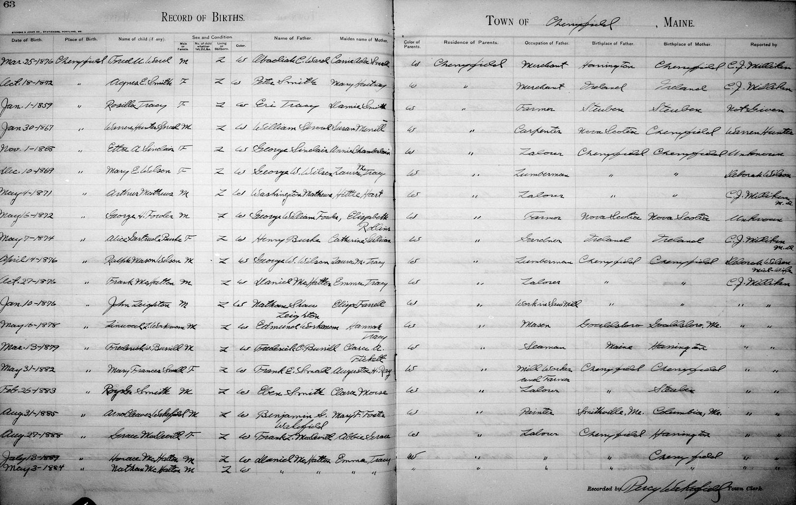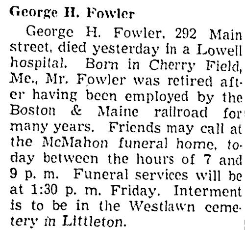Birth Born on May 16, 1872 in Cherryfield, Washington Co., ME Death Died on May 13, 1953 in Lowell, Middlesex Co., MA Buried in Westlawn Cemetery in Littleton, Middlesex Co., MA Marriages MACKINLEY, Laura Evelyn Married on 1933 in Wilmington, Middlesex Co., MA Notes Occupation: Trackman Boston & Maine RR Sources Massachusetts Deaths: Littleton Pg. 72 Images George H. Fowler Birth Brunswick,Laura (MacKinley),George H. Fowler,Alice (MacKinley) & Rollin Benson George H. Fowler Death George H. Fowler Obit The Lowell Sun Lowell,MA May 14,1953