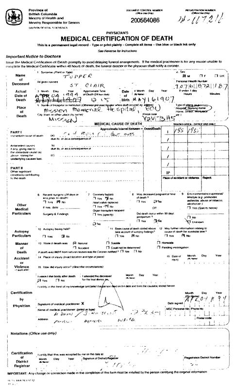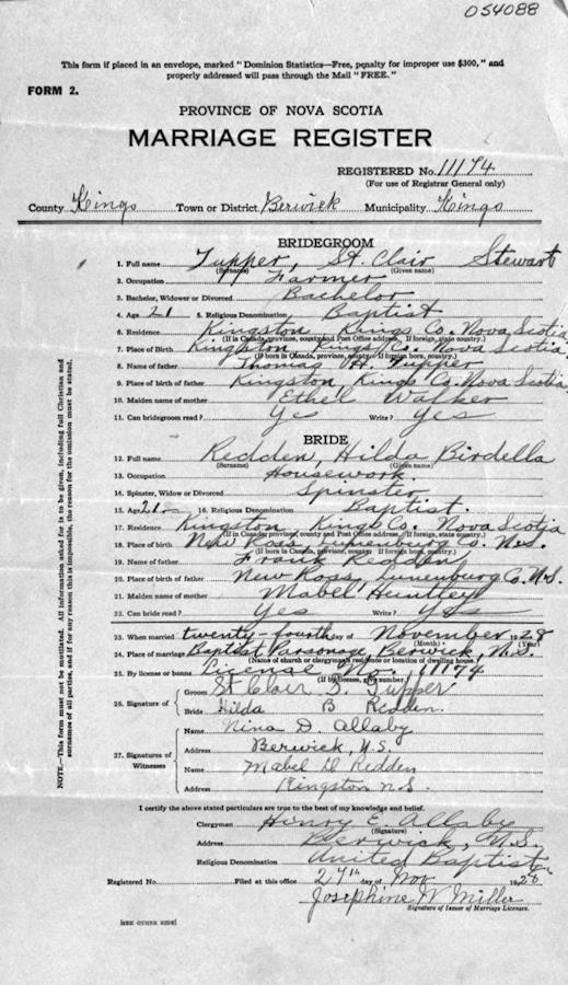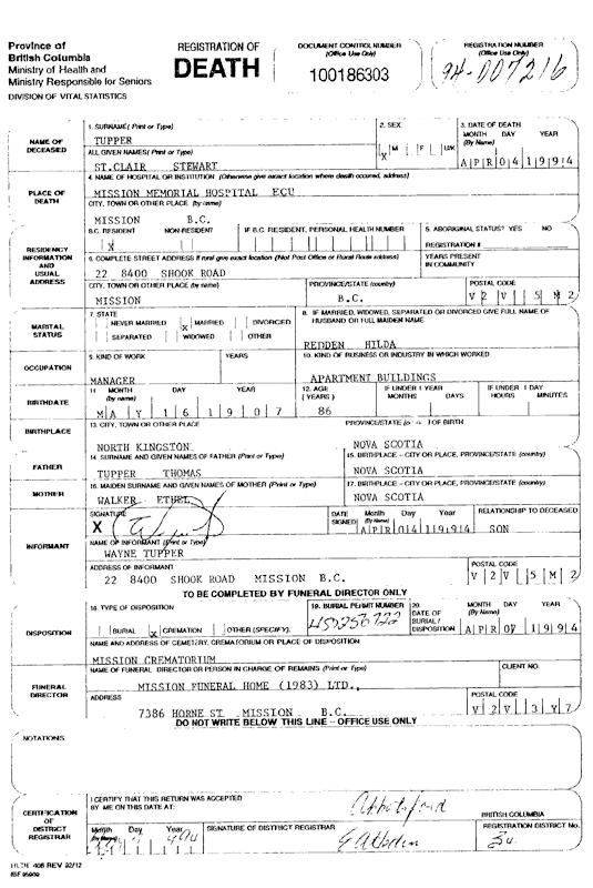 Parents Father: TUPPER, Thomas Handley Mother: WALKER, Ethel May Birth Born on May 16, 1907 in Kingston, Kings Co., NS Death Died on April 04, 1994 in Mission, Fraser Valley Region, BC Marriages REDDEN, Hilda Birdella Married on November 24, 1928 in Berwick, Kings Co., NS Children TUPPER, Elizabeth TUPPER, Wayne Notes Occupation: Farmer/ Manager Apartment Buildings Death: Carcinoma Sources BC Deaths: #94-007216 Images St. Clair Tupper Death1 St. Clair Tupper Death St. Clair Tupper Marriage
