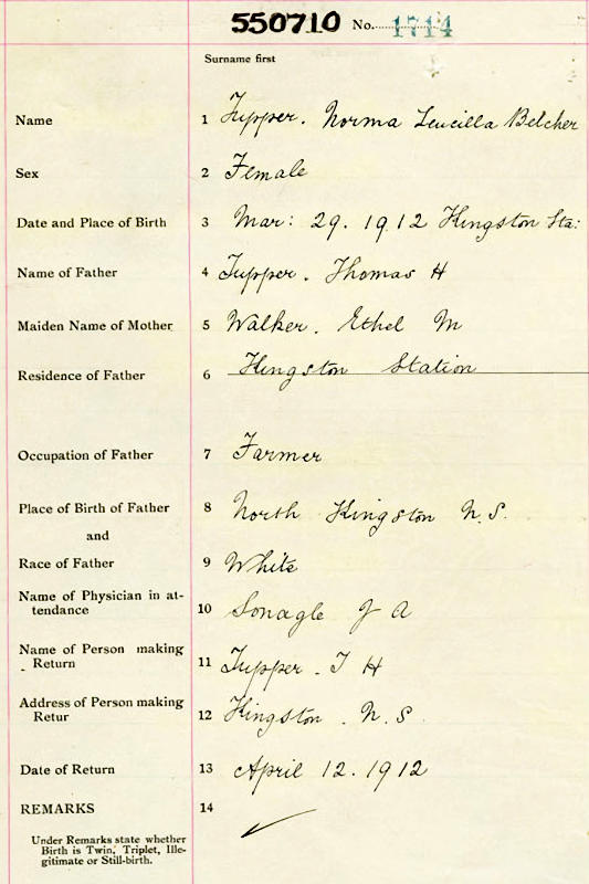 Parents Father: TUPPER, Thomas Handley Mother: WALKER, Ethel May Birth Born on March 29, 1912 in Kingston Station, Kings Co., NS Death Died on March 16, 1945 in Montreal, QC Buried in Old Kingston Cemetery in Kingston, Kings Co., NB Sources Findagrave.com: https://www.findagrave.com/memorial/187378312/norma_lucilla_belcher-peterson Images Norma Tupper Birth Thomas & Ethel (Walker) Tupper,Norma (Tupper) Peterson