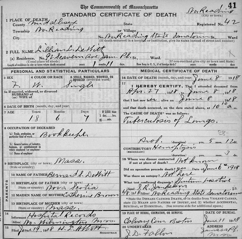 Parents Father: DEWITT, Bernard S. Mother: BROWN, Katharine F. Birth Born on December 01, 1899 in Boston, Suffolk Co., MA Death Died on June 08, 1918 in North Reading, Middlesex Co., MA Buried in Calvary Cemetery in Boston, Suffolk Co., MA Notes Occupation: Bookkeeper Death: Tuberculosis Sources Massachusetts Deaths: North Reading Pg. 41 #42 Images Lillian Dewitt Birth Lillian Dewitt Death