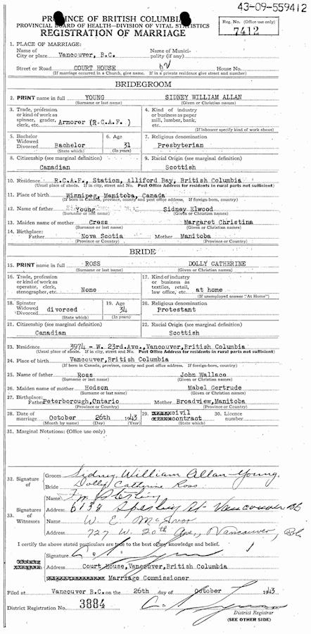 Parents Father: YOUNG, Sidney Elwood Mother: CRESS, Margaret Christina Birth Born on February 23, 1912 in Winnipeg, Winnipeg Capital Region, MB Death Died on February 19, 1990 in North Vancouver, Metro Vancouver Region, BC Buried in Boal Chapel Memorial Gardens in North Vancouver, Metro Vancouver Region, BC Marriages ROSS, Dolly Catherine Married on October 26, 1943 in Vancouver, Metro Vancouver Region, BC Children YOUNG, John D. Notes Military Service: WW2 RCAF Images Sidney W. Young Marriage