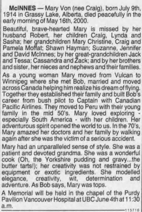 Parents Father: CRAIG, Owen Albert Mother: YOUNG, Mollie Clare Birth Born on July 09, 1914 in Grassy Lake, Municipal District of Taber, AB Death Died on May 16, 2000 in Vancouver, Metro Vancouver Region, BC Marriages McINNES, Robert Arnott Married on 1940 Children McINNES, Craig McINNES, Lynda McINNES, Sasha Sources Newspaper Obituary: The Province Vancouver,BC May 28, 2000 Images Mary (Craig) McInnes Obit The Province Vancouver,BC May 28, 2000