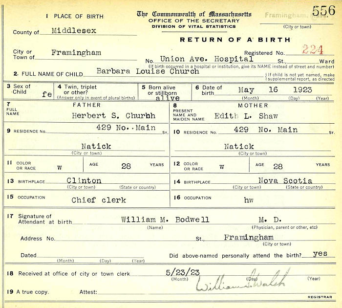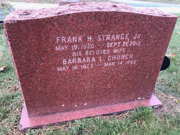 Parents Father: CHURCH, Herbert Stephen Mother: SHAW, Edith Louise Birth Born on May 16, 1923 in Framingham, Middlesex Co., MA Death Died on March 14, 1990 in Natick, Middlesex Co., MA Buried in Dell Park Cemetery in Natick, Middlesex Co., MA Marriages STRANGE, Frank Hiatt Married on 1943 Children STRANGE, Frank Hiatt: November 08, 1946 STRANGE, Susan L.: March 05, 1950 Sources Massachusetts Deaths: #021467 Images Barbara Church Birth Frank & Barbara (Church) Strange