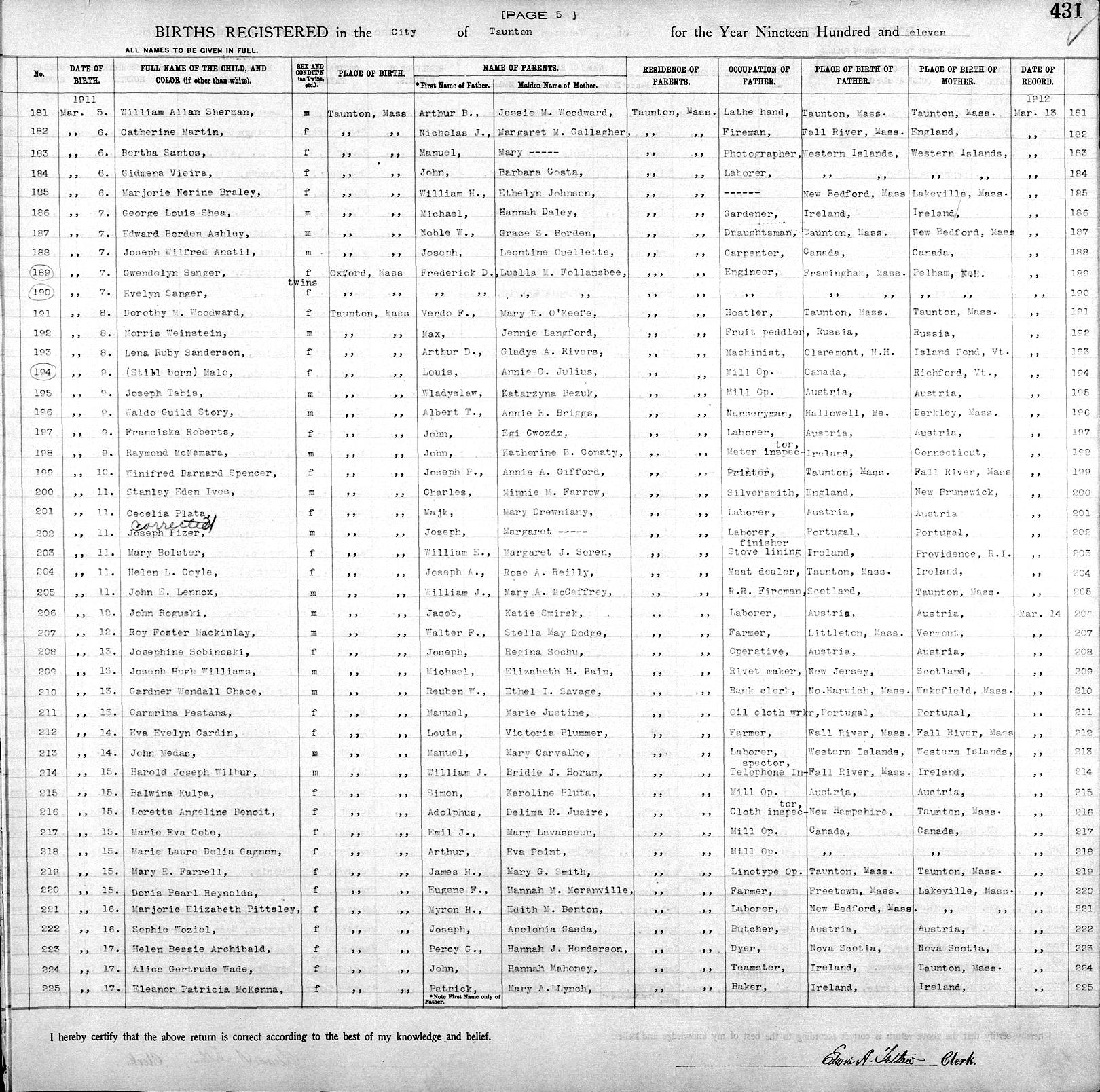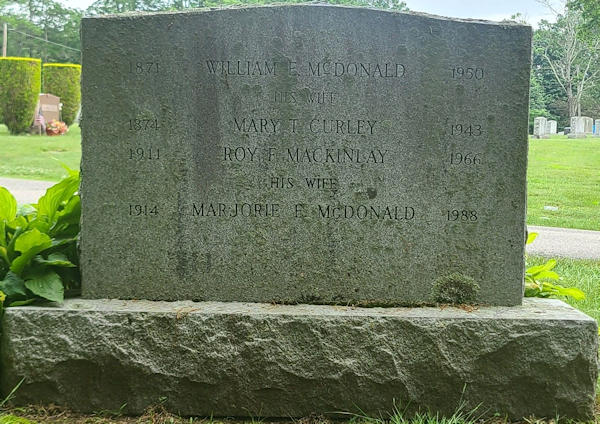 Parents Father: MACKINLEY, Walter Foster Mother: DODGE, Stella May Birth Born on March 12, 1911 in Taunton, Bristol Co., MA Death Died on 1966 in Bristol Co., MA Buried in Saint Mary's Cemetery in North Attleboro, Bristol Co., MA Marriages McDONALD, Marjorie Eleanor Children MACKINLAY, Mary Elaine: July 15, 1942 MACKINLAY, Marjorie E.: April 19, 1945 - February 22, 2015 Notes Occupation: Truck Driver Images Roy MacKinley Birth Roy & Marjorie (McDonald) MacKinley