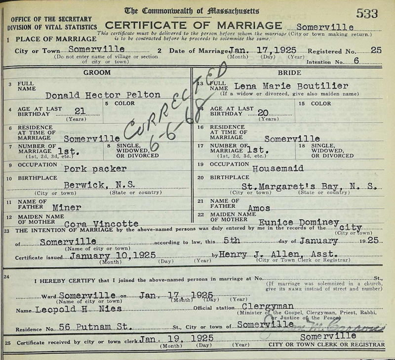 Parents Father: PELTON, Miner Foster Mother: VEINOT, Cora Birth Born on February 17, 1903 in Berwick, Kings Co., NS Death Died on March 07, 1993 in Somerville, Middlesex Co., MA Buried in The Gardens Cemetery in West Roxbury, Suffolk Co., MA Marriages BOUTILIER, Carolyn Marie Married on January 17, 1925 in Somerville, Middlesex Co., MA Children PELTON, Loretta PELTON, Muriel E.: July 15, 1925 - June 22, 2007 PELTON, Gladys L.: May 19, 1933 PELTON, Robert: 1934 PELTON, Kenneth L.: December 02, 1935 Notes Occupation: Pork Packer/ Fireman/ Machine Shop Sources Massachusetts Deaths: #026138 Images Donald & Carolyn (Boutilier) Pelton Donald Pelton Marriage