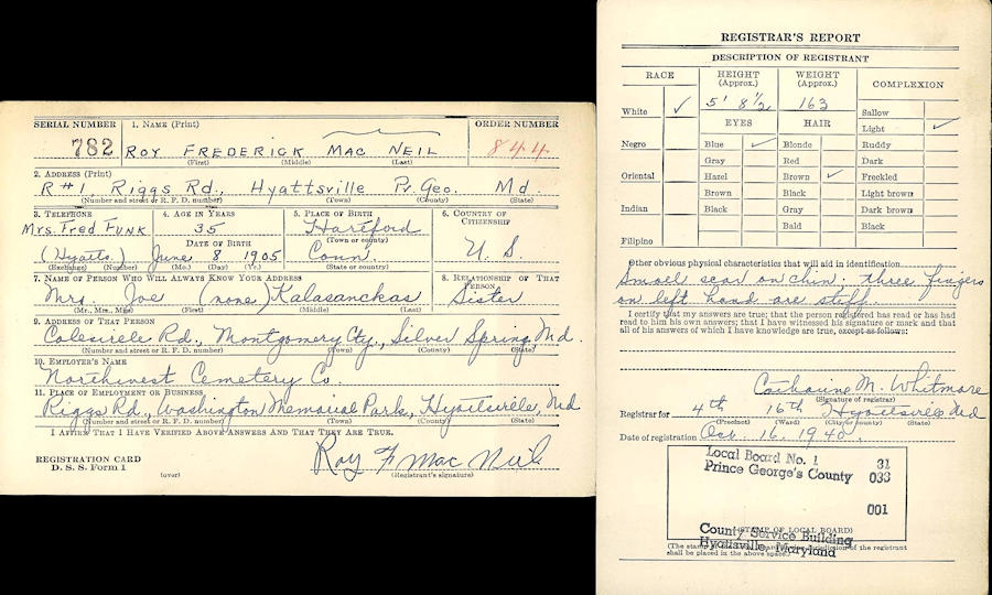 Parents Father: McNEIL, John Frederick Mother: PERRY, Mary Jeanetta Whitney Birth Born on June 08, 1905 in Hartford, Cumberland Co., NS Death Died on December 28, 1973 in Alachua Co., FL Buried in Brooksville Cemetery in Brooksville, Hernando Co., FL Marriages MITCHELL, Lila R. Married on January 19, 1931 in Battle Creek, Calhoun Co., MI Notes Occupation: Painter/ Aircraft Mechanic Eastern Airlines Sources Florida Deaths: #81703 Images Roy & Lila (Mitchell) MacNeil Roy MacNeil WW2 Draft