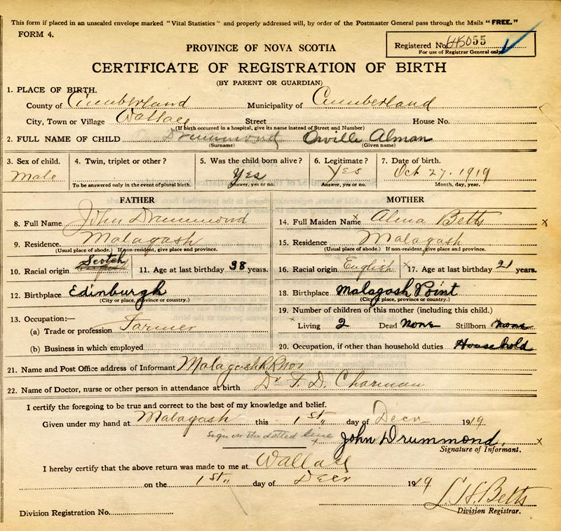 Parents Father: DRUMMOND, John Mother: BETTS, Myrtle Alma Birth Born on October 27, 1920 in Wallace, Cumberland Co., NS Death Died on August 14, 1941 in Malagash Point, Cumberland Co., NS Buried in Malagash United Church Cemetery Malagash,NS in Malagash, Cumberland Co., NS Notes Death: Carcinoma of Rectum Occupation: Salt Miner Sources Nova Scotia Deaths: Book 199 Pg. 348 Images Orville Drummond Birth Orville Drummond Orville Drummond Death