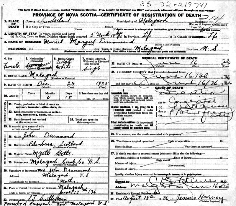 Parents Father: DRUMMOND, John Mother: BETTS, Myrtle Alma Birth Born on December 28, 1935 in Malagash, Cumberland Co., NS Death Died on June 16, 1936 in Malagash, Cumberland Co., NS Buried in Malagash United Church Cemetery Malagash,NS in Malagash, Cumberland Co., NS Notes Death: Inanition/ Congenital Heart Disease Sources Cumberland Cemetery Records: Malagash United Church Cemetery Malagash,NS Images Muriel Drummond Death
