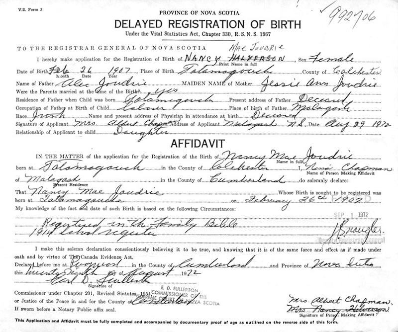 Parents Father: JOUDRIE, Alexander Mother: JOUDRIE, Jessie Anna Birth Born on February 26, 1907 in Tatamagouche, Colchester Co., NS Death Buried in Monument Hill Cemetery in Wallace Grant, Cumberland Co., NS Marriages HALVERSON, Martin W. Married on March 24, 1943 in Oxford, Cumberland Co., NS JOUDRIE, Frank Married on February 13, 1930 in Pictou, Pictou Co., NS Children JOUDRIE, Clarence S.: 1928 - 1997 HALVERSON, Nina Mae: July 31, 1944 - October 26, 2016 HALVERSON, Carl: 1951 - 1951 Images Nancy Joudrie Birth Wendell Langille Birth Martin & Nancy (Joudrie) & Carl Halverson Nancy Joudrie Marriage Nancy( Joudrie) Joudrie Marriage