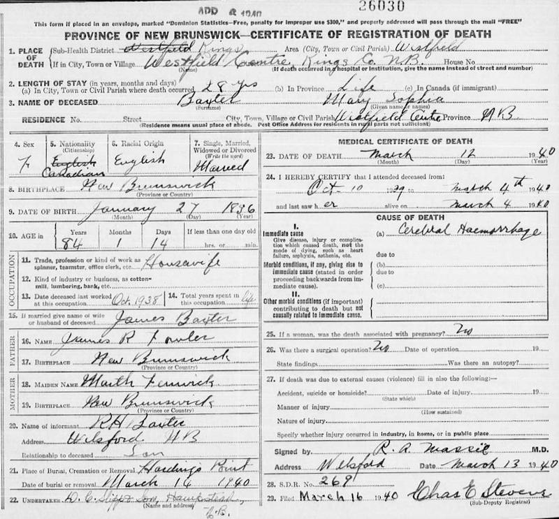 Parents Father: FOWLER, James Rulof Mother: FENWICK, Martha Birth Born on January 27, 1856 in Upham, Kings Co., NB Death Died on March 12, 1940 in Westfield Centre, Kings Co., NB Buried in Hardings Point Loyalist Cemetery in Hardings Point, Kings Co., NB Marriages BAXTER, James Married on February 14, 1888 in Westfield, Kings Co., NB Children BAXTER, James Fenwick: January 08, 1889 - July 18, 1908 BAXTER, Robert Henry: January 28, 1892 - February 01, 1990 BAXTER, Martha Grace: March 28, 1893 - September 13, 1911 BAXTER, Ruth: March 28, 1895 - December 14, 1973 BAXTER, Joseph Rulofson Fowler: April 30, 1899 - August 31, 1988 Notes Marriage Notice: m. At residence of bride's parents, 14th Feb., by Rev. James Crisp, James BAXTER, Westfield (Kings Co.) / Mary S. FOWLER youngest d/o James R. FOWLER, Esq., Upham Station (Kings Co.) The Daily Telegraph Saint John,NB February 17,1888 Death: Cerebral Hemorhage Sources NB Deaths: #26030 Images James & Mary (Fowler) & James F. & Martha Baxter Mary (Fowler) Baxter Death Mary Fowler Marriage Mary (Fowler) & James Baxter