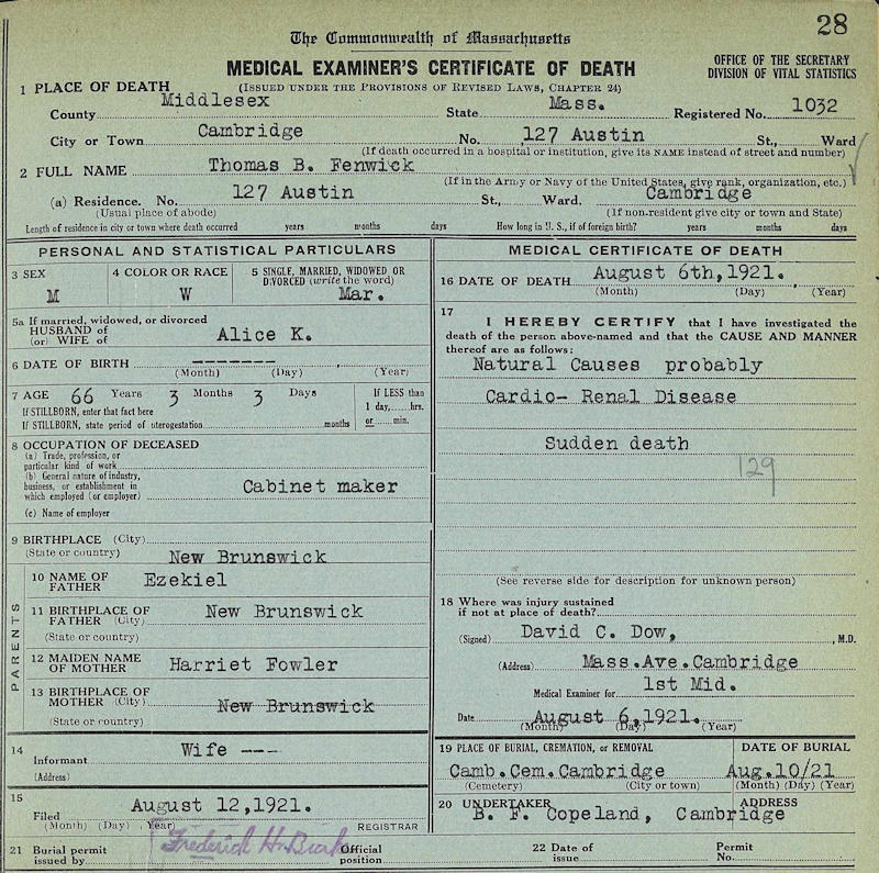 Parents Father: FENWICK, Ezekiel Barlow Mother: FOWLER, Harriet Caroline Birth Born on May 03, 1855 in Upham, Kings Co., NB Death Died on August 06, 1921 in Cambridge, Middlesex Co., MA Buried in Cambridge Cemetery in Cambridge, Middlesex Co., MA Marriages LAWSON, Alice K. Married on September 28, 1886 in Barnesville, Kings Co., NB Children FENWICK, Margaret Hastings: March 11, 1890 - May 14, 1968 Notes Occupation: Carpenter/ Cabinet Maker Marriage Notice: m. Barnesville (Kings Co.) 28th ult., by father of the bride, T. Beverley FENWICK, Boston, Mass. / Alice LAWSON third d/o Rev. J.R. LAWSON, Barnesville Death: Cardio-Renal Disease Sources Massachusetts Deaths: Cambridge Pg. 28 #1032 Images Thomas Fenwick Death Thomas Fenwick Naturalization