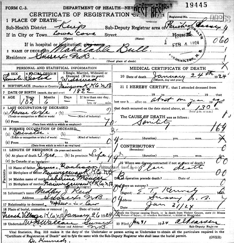Parents Father: RULOFSON, Isaac Allen Mother: MUNGER, Catherine Birth Born on September 29, 1821 in Hampton, Kings Co., NB Death Died on January 24, 1924 in Apohaqui, Kings Co., NB Marriages BULL, James Married on December 29, 1840 in Hampton, Kings Co., NB Notes Death: Senility Sources NB Deaths: #19445 Images Mary (Rulofson) Bull Death Mary Rulofson Marriage