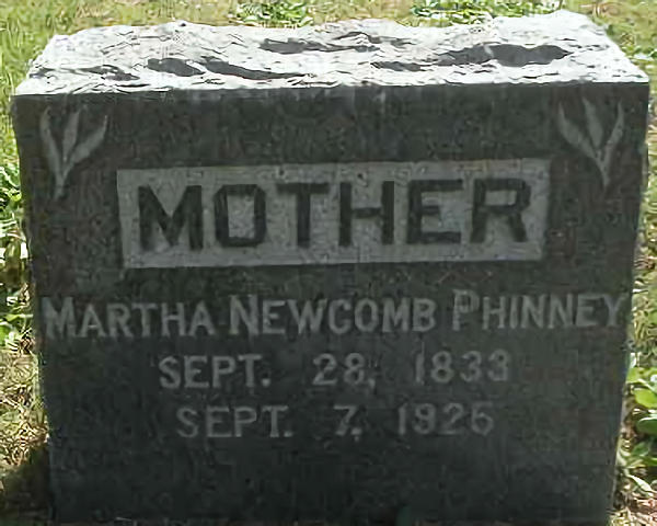 Parents Father: NEWCOMB, Leonard Mother: BORDEN, Elizabeth Birth Born on September 28, 1833 in Cornwallis, Kings Co., NS Death Died on September 07, 1925 in Los Angeles, Los Angeles Co., CA Buried in Hollywood Forever Cemetery in Los Angeles, Los Angeles Co., CA Marriages PHINNEY, David Borden Married on January 26, 1859 in Annapolis Co., NS Children PHINNEY, Laura Newcomb: November 12, 1859 - January 22, 1950 PHINNEY, Byron Borden: December 12, 1860 PHINNEY, Donald S. G.: April 02, 1863 - February 10, 1864 PHINNEY, Alice M.: June 17, 1865 - January 28, 1867 PHINNEY, Leonard Newcomb: June 24, 1867 - December 24, 1935 PHINNEY, William S.: 1875 - September 07, 1875 Sources California Deaths: Pg. 8600 #41210 Images Martha (Newcomb) Phinney Martha (Newcomb) Phinney Death