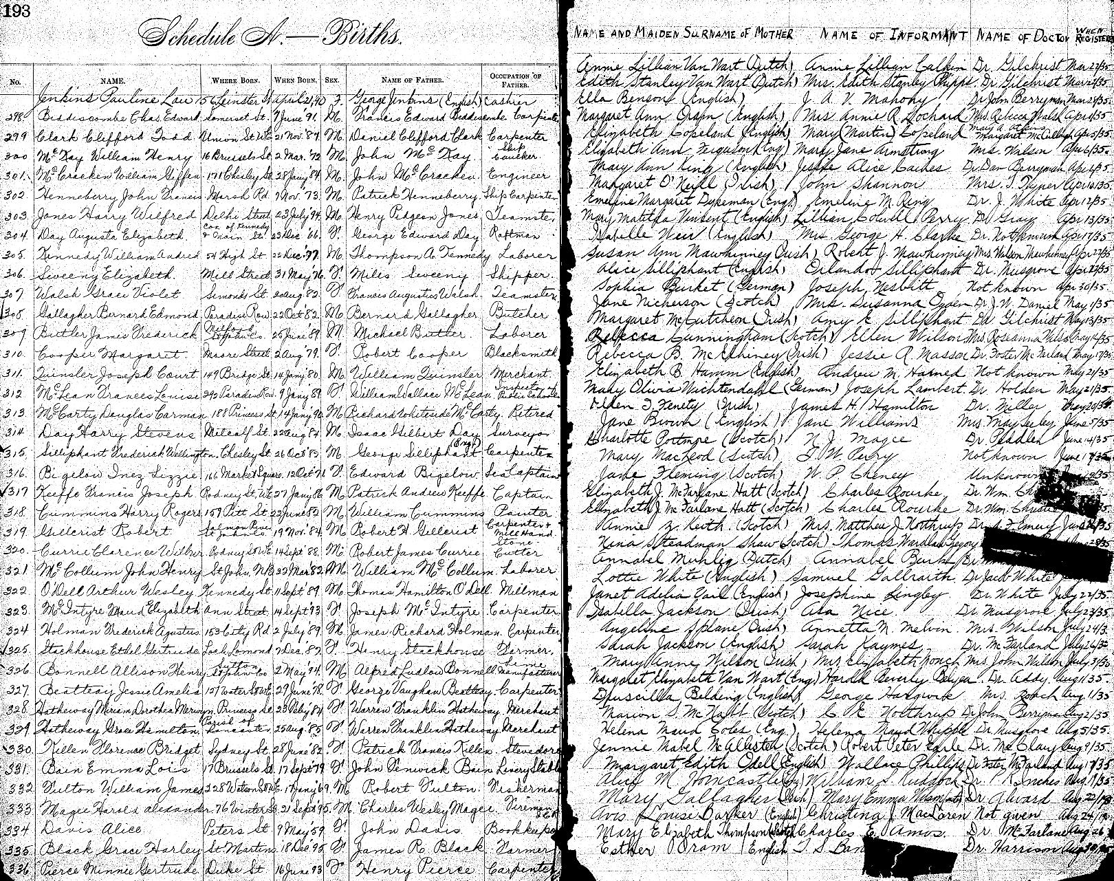 Parents Father: McCOLLUM, William Mother: FOSTER, Catherine Birth Born on March 22, 1882 in Saint John, Saint John Co., NB Death Died on August 04, 1974 in Newton, Middlesex Co., MA Marriages FINNAMORE, Ada Married on January 02, 1902 in Saint John, Saint John Co., NB Children McCOLLUM, Ada Christine: April 16, 1903 - May 05, 1974 McCOLLOM, Albert Edward: July 26, 1905 - December 26, 1998 McCOLLUM, Hazel Marguerite: December 31, 1906 - November 07, 1998 McCOLLUM, Nora Bernice: September 01, 1909 - January 05, 1983 McCOLLUM, Dorothy Catherine: September 21, 1911 - August 15, 1993 McCOLLUM, Mary Pauline: November 10, 1915 McCOLLUM, Boy: January 13, 1924 - January 13, 1924 Notes Occupation: Baker/ Police Officer/ Salesman Sources Massachusetts Deaths: #042366 Images John McCollom Birth John McColl;om Marriage