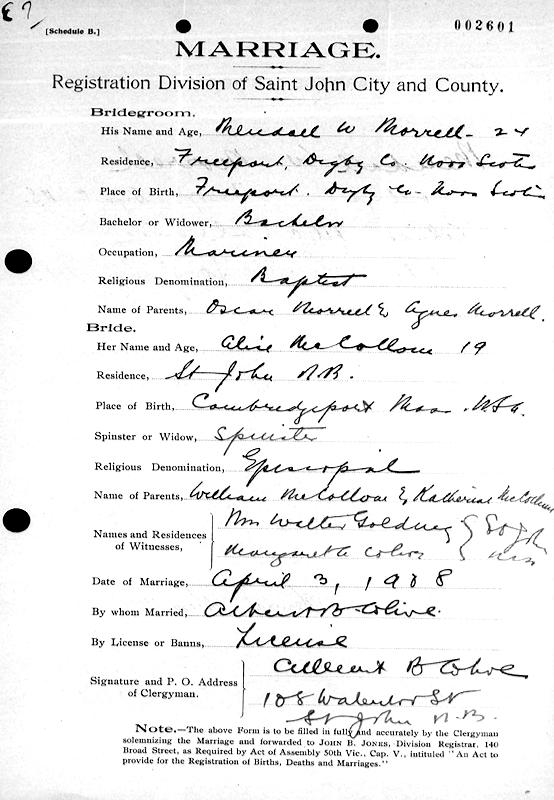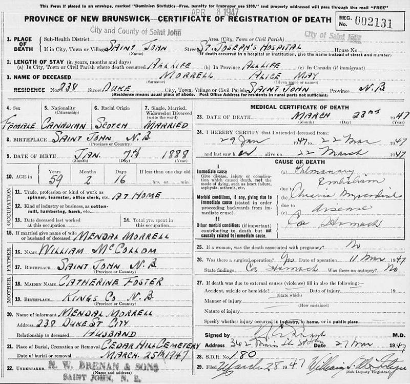 Parents Father: McCOLLUM, William Mother: FOSTER, Catherine Birth Born on January 07, 1888 in Cambridgeport, Middlesex Co., MA Death Died on March 23, 1947 in Saint John, Saint John Co., NB Buried in Cedar Hill Cemetery in Saint John, Saint John Co., NB Marriages MORRELL, Mendal Willfred Married on April 03, 1908 in Saint John, Saint John Co., NB Children MORRELL, Hazel Gertrude: November 12, 1908 MORRELL, Agnes May: May 22, 1911 MORRELL, Mildred Foster Bernice: June 06, 1914 Notes Death: Pulmonary Embolism Sources NB Deaths: #2131 Images Catharine M. Phinney Marriage Certificate Alice (McCollom) Morrell Death Alice McCollom Marriage