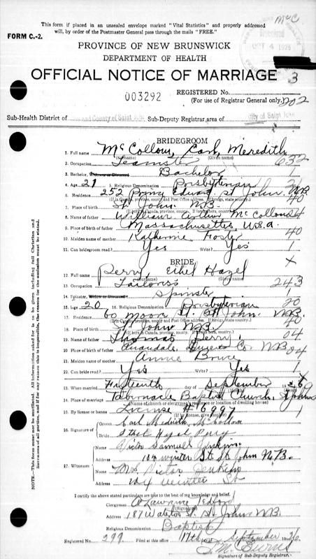 Parents Father: McCOLLUM, William Mother: FOSTER, Catherine Birth Born on 1905 in Saint John, Saint John Co., NB Death Died on 1977 in Oldcastle, Essex Co., ON Buried in Greenlawn Memorial Gardens in Oldcastle, Essex Co., ON Marriages PERRY, Ethel Hazel Married on September 15, 1926 in Saint John, Saint John Co., NB Children McCOLLOM, Kenneth Bruce: April 02, 1927 McCOLLOM, Doreen: 1929 Notes Occupation: Teanster Sources Cemetery: Greenlawn Memorial Gardens Oldcastle,ON Images Carl McCollom Carl McCollom Marriage