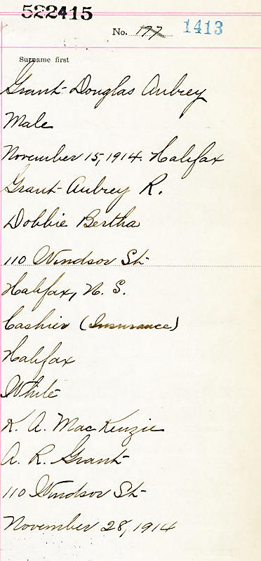Birth Born on November 15, 1914 in Halifax, Halifax Regional Municipality, NS Death Died on April 24, 1992 in Halifax, Halifax Regional Municipality, NS Marriages BISHOP, June Suzanne Married on February 12, 1944 in Bloomfield, Essex Co., NJ Children GRANT, John B. GRANT, Kenneth R. GRANT, D. Alexander Sources Mormons: https://www.familysearch.org/en/tree/person/details/GKND-L9V Images Douglas Grant Birth
