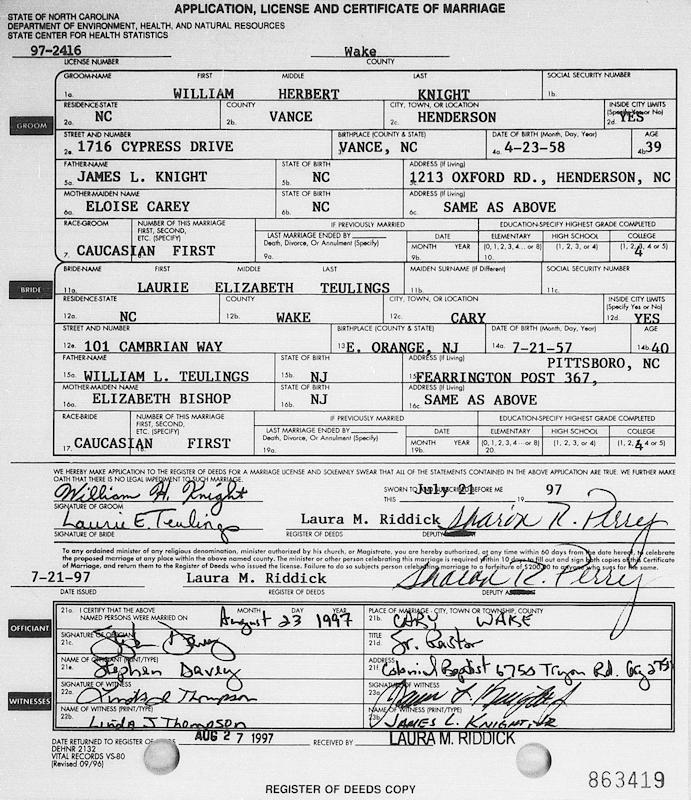Parents Father: TEULINGS, William Lawrence Mother: BISHOP, Muriel Elizabeth Birth Born on July 21, 1957 in East Orange, Essex Co., NJ Marriages KNIGHT, William Herbert Married on August 23, 1997 in Cary, Wake Co., NC Children KNIGHT, John: 1998 Images Laurie Teulings Marriage