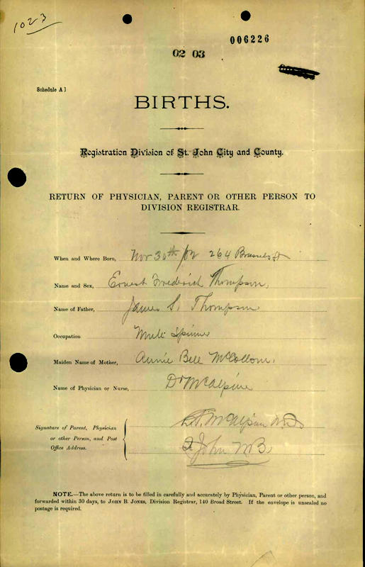 Parents Father: THOMPSON, James Samuel Mother: McCOLLOM, Ann Bell Birth Born on November 30, 1902 in Saint John, Saint John Co., NB Death Died on December 06, 1981 in Saint John, Saint John Co., NB Buried in Fernhill Cemetery in Saint John, Saint John Co., NB Marriages STEEN, Elizabeth May Married on June 23, 1923 in Fairville, Saint John Co., NB Children THOMPSON, Raymond Ernest: July 10, 1923 - 2009 THOMPSON, Annie Bell Helen: August 15, 1924 - March 04, 2017 THOMPSON, James Edward: January 23, 1927 - 1989 THOMPSON, William Robert: April 15, 1928 THOMPSON, Beatty Earl: October 09, 1929 - 1976 Notes Occupation: Mechanic Sources Findagrave.com: https://www.findagrave.com/memorial/235028768/ernest_frederick-thompson Images Ernest Thompson Birth Ernest Thompson Marriage
