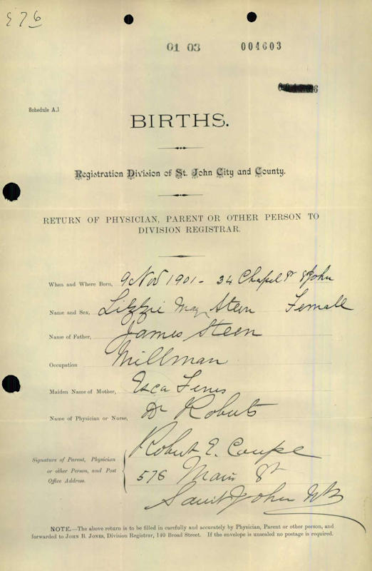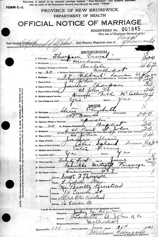 Birth Born on November 09, 1901 in Saint John, Saint John Co., NB Death Died on January 24, 1980 in Saint John, Saint John Co., NB Buried in Fernhill Cemetery in Saint John, Saint John Co., NB Marriages THOMPSON, Ernest Frederick Married on June 23, 1923 in Fairville, Saint John Co., NB Children THOMPSON, Raymond Ernest: July 10, 1923 - 2009 THOMPSON, Annie Bell Helen: August 15, 1924 - March 04, 2017 THOMPSON, James Edward: January 23, 1927 - 1989 THOMPSON, William Robert: April 15, 1928 THOMPSON, Beatty Earl: October 09, 1929 - 1976 Sources Findagrave.com: https://www.findagrave.com/memorial/235028802/elizabeth_may-thompson Images Elizabeth Steen Birth Ernest Thompson Marriage