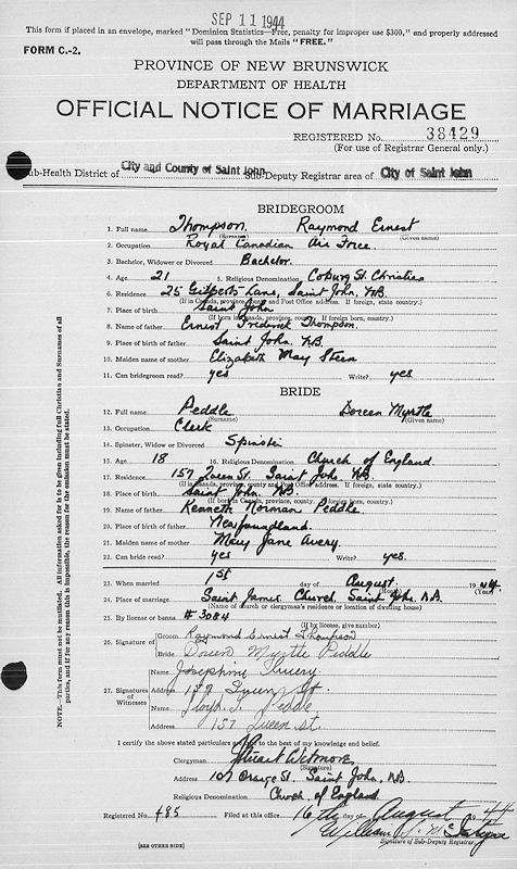 Parents Father: THOMPSON, Ernest Frederick Mother: STEEN, Elizabeth May Birth Born on July 10, 1923 in Saint John, Saint John Co., NB Death Died on 2009 in Saint John, Saint John Co., NB Buried in Fernhill Cemetery in Saint John, Saint John Co., NB Marriages PEDDLE, Doreen Myrtle Married on August 01, 1944 in Saint John, Saint John Co., NB Notes Military Service: WW2 RCAF Sources Findagrave.com: https://www.findagrave.com/memorial/235037129/ray_ernest-thompson Images Raymond Thompson Marriage Elizabeth (Brinton) & George & Shirley Munroe Elizabeth Brinton
