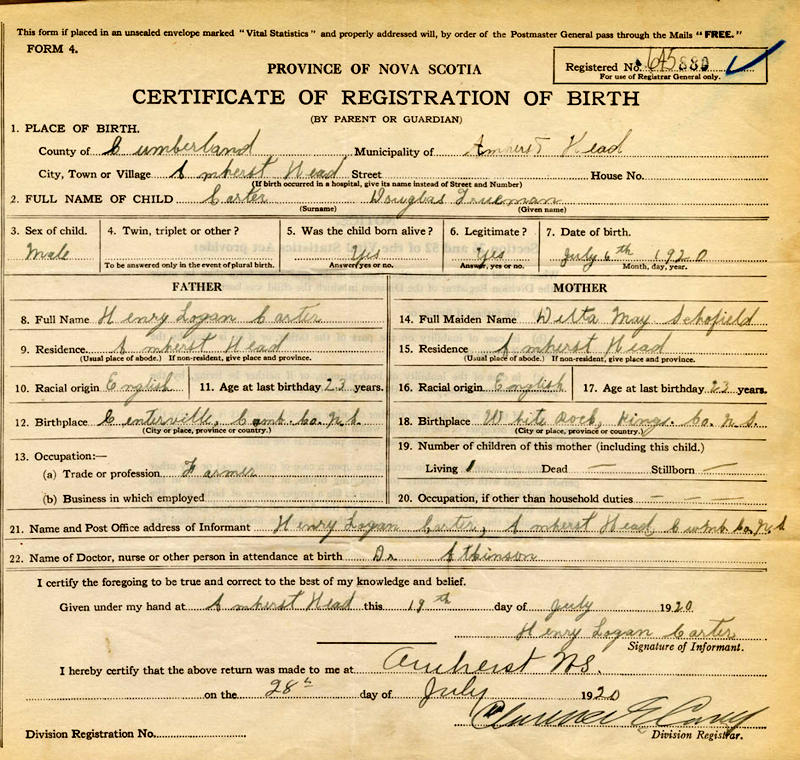 Birth Born on July 06, 1920 in Amherst Head, Cumberland Co., NS Death Died on April 26, 2014 in Saint John, Saint John Co., NB Buried in Greenwood Cemetery in Saint John, Saint John Co., NB Marriages THOMPSON, Annie Bell Helen Married on November 12, 1941 in Saint John, Saint John Co., NB Children CARTER, William CARTER, Betty-Ann CARTER, Deborah CARTER, Douglas Ernest Henry: 1942 CARTER, Frederick Truman: 1944 Notes Military Service: WW2 RC Army Obituary: CARTER, DOUGLAS TRUEMAN - Douglas Trueman Carter passed away peacefully surrounded by his loving family on April 26th, 2014 at Bobby's Hospice. Born in Amherst, NS on July 6, 1920 he was the son of the late Henry and Delta (Schofield) Carter. He was a retired station manager for the Saint John West Post Office. Doug was a WWII Veteran, and served in England, North Africa, Italy, France, Belgium and Holland. He was a member of the Royal Canadian Legion Branch #2. Doug was a founding member, life deacon and served as Pastor of Visitation of Hillcrest Baptist Church. He was the Westside Food Bank founder and president for 17 years, past president of Heritage Club of NB and volunteer for meals on wheels. In 2003 Doug and Ann received the "Maritimer of the Week Award." Doug is survived by Ann his loving wife of 73 years; three sons Doug (Pat) of Ottawa, Fred (Cheryl) of Greenwood, NS, Bill (Judy) of Clandonald, AB; two daughters Betty-Ann (Gerald) Taylor of Fredericton and Debbie Carter of Fredericton. Also survived by 11 grandchildren, 15 great-grandchildren and several nieces and nephews. Besides his parents Doug was predeceased by one grandson Todd Carter. Resting at Castle Funeral Home, 309 Lancaster Ave. Saint John. Visitation will take place on Tuesday, April 29, 2014 from 2 to 4pm and 7 to 9pm. A Funeral Service will be held from Hillcrest Baptist Church on Wednesday, April 30, 2014 at 2:00pm with Rev. Andrew Morse Officiating. In lieu of flowers donations may be made to Bobby's Hospice, Westside Food Bank or the Hillcrest Baptist Church. Online condolences can be made at www.castlefh.com Occupation: Manager Saint John West Post Office Sources Funeral Home: Castle Funeral Home Saint John,NB Obituary April 2014 Images Douglas Carter Birth Douglas & Annie (Thompson) Carter Annie Thompson Marriage Douglas Carter