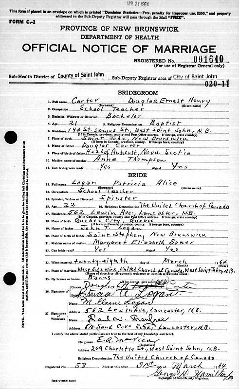 Birth Born on 1941 in Quebec City, Capitale-Nationale, QC Marriages CARTER, Douglas Ernest Henry Married on March 28, 1964 in West Saint John, Saint John Co., NB Notes Occupation: Teacher Images Douglas E, Carter Marriage
