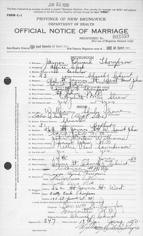 Parents Father: THOMPSON, Ernest Frederick Mother: STEEN, Elizabeth May Birth Born on January 23, 1927 in Saint John, Saint John Co., NB Death Died on 1989 in Saint John, Saint John Co., NB Marriages WILLIAMS, Shirley Irene Married on June 14, 1950 in Saint John, Saint John Co., NB Children THOMPSON, James Robert: July 03, 1951 - January 27, 2019 Sources Findagrave.com: https://www.familysearch.org/en/tree/person/details/GS5L-YNP Images James E. Thompson Marriage Alice (Brinton) & George Connor Alice Brinton