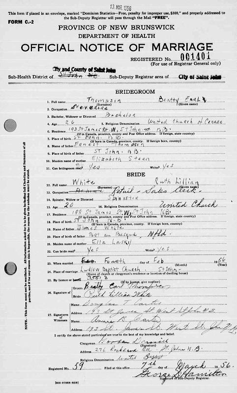Parents Father: THOMPSON, Ernest Frederick Mother: STEEN, Elizabeth May Birth Born on October 09, 1929 in Saint John, Saint John Co., NB Death Died on 1976 in Saint John, Saint John Co., NB Buried in Cedar Hill Extension Cemetery in Saint John, Saint John Co., NB Marriages WHITE, Ruth Lillian Married on February 04, 1956 in Saint John, Saint John Co., NB Notes Occupation: Stevedore Military Service: RC Army Sources NB Cemeteries: Cedar Hill Extension Cemetery Saint John,NB Images Beatty Thompson Beatty Thompson Marriage