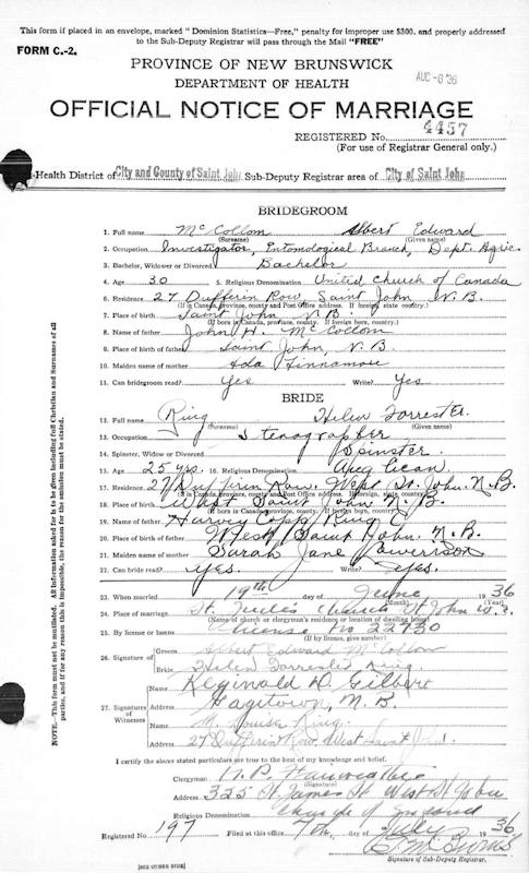 Parents Father: McCOLLUM, John Henry Mother: FINNAMORE, Ada Birth Born on July 26, 1905 in Saint John, Saint John Co., NB Death Died on December 26, 1998 in Saint John, Saint John Co., NB Buried in Cedar Hill Cemetery in Saint John, Saint John Co., NB Marriages CLARKE, Constance Eileen Married on June 01, 1944 in Renforth, Kings Co., NB RING, Helen Forrester Married on June 19, 1936 in Saint John, Saint John Co., NB Children McCOLLOM, Helen Forrester: May 14, 1937 - August 13, 2020 Notes Occupation: Investigator Entomological Dept. of Agriculture Sources Mormons: https://www.familysearch.org/en/tree/person/details/GQFH-K32 Images Albert McCollom Birth Albert McCollom Marriage Albert McCollom Marriage2 Constance (Clarke) & Albert McCollom