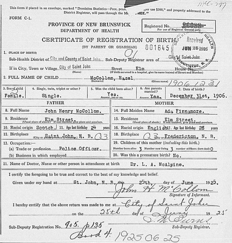 Parents Father: McCOLLUM, John Henry Mother: FINNAMORE, Ada Birth Born on December 31, 1906 in Saint John, Saint John Co., NB Death Died on November 07, 1998 in Medway, Norfolk Co., MA Buried in Newton Cemetery in Newton, Middlesex Co., MA Marriages ROBERTSON, Ruric Ritchie Children ROBERTSON, Ruric Ritchie: June 21, 1933 - November 12, 2021 Sources Massachusetts Deaths: #055792 Images Hazel McCollom Birth
