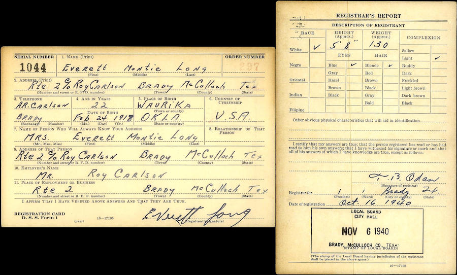 Birth Born on February 24, 1918 in Menard, Menard Co., TX Death Died on July 31, 1987 in Houston, Harris Co., TX Buried in Forest Park East Cemetery in Webster, Harris Co., TX Marriages MARTIN, Zeola Belle Married on September 28, 1940 in Texas, USA Children LONG, La Nette Anna: January 19, 1942 LONG, Monta Eugenia: May 08, 1944 LONG, Martin Montgomery: October 08, 1946 Notes Occupation: Farm worker/ Carpenter Images Everett Long Birth Everett Long WW2 Draft
