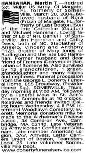 Birth Born on February 15, 1930 in Boston, Suffolk Co., MA Death Died on March 20, 2004 in Margate, Broward Co., FL Buried in Woodlawn Cemetery in Everett, Middlesex Co., MA Marriages DALRYMPLE, Frances Ann Children HANRAHAN, Catherine HANRAHAN, Edward A.: July 06, 1956 HANRAHAN, James Michael: September 24, 1958 HANRAHAN, Daniel T.: December 19, 1960 Notes Military Service: Korea, Vietnam US Army Sergeant Major Images Martin Hanrahan Obit