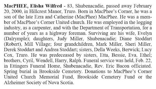 Birth Born on November 23, 1915 in MacPhees Corner, Hants Co., NS Death Died on February 20, 2000 in Truro, Colchester Co., NS Buried in Brookside Cemetery in Mill Village, Hants Co., NS Marriages DALRYMPLE, Evelyn Doreen Children MACPHEE, Diane MACPHEE, Judith Catherine: November 02, 1947 - May 16, 2014 Notes Obituary: The Chronicle Herald 21 February 2000 MacPhee, Elisha Wilfred - 83, Shubenacadie, passed away February 20, 2000, in Hillcrest Manor, Truro. Born in MacPhee's Corner, he was a son of the late Ezra and Catherine (MacPhee) MacPhee. He was a member of MacPhee's Corner United Church. He was employed in the logging industry, as a carpenter, and with the Department of Transportation, for a number of years as a highway foreman. Surviving are his wife, Evelyn (Dalrymple); daughters, Judy Miller, Shubenacadie; Diane Stoddart (Robert), Mill Village; four grandchildren, Mark Miller, Sheri Miller. Derek Stoddart and Andrea Stoddart; sisters, Della Weeks, Berwick; Lucy Cox, Truro. He was predeceased by sisters, Etta, Bessie, Eva, Ethel; brothers, Cyril, Wendell, Harry, Ralph. Visitation 7-9 p.m. today, February 21, funeral service will be 2 p.m. Tuesday, February 22, both in Ettingers Funeral Home, Shubenacadie, Rev. Eric Bacon officiating. Spring Burial in Brookside Cemetery. Family flowers only, donations to MacPhee Corner United Church Memorial Fund, Brookside Cemetery Fund or the Alzheimer Society of Nova Scotia. Occupation: Carpenter/ Highway Foreman - NS Dept of Transportation Sources Halifax Herald: Obituary February 21,2000 Images Elisha MacPhee Obit