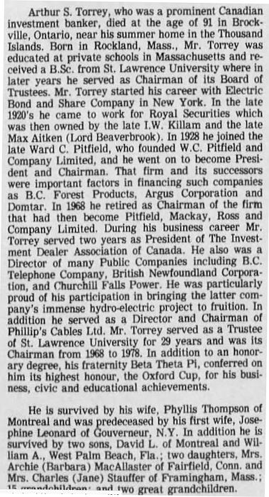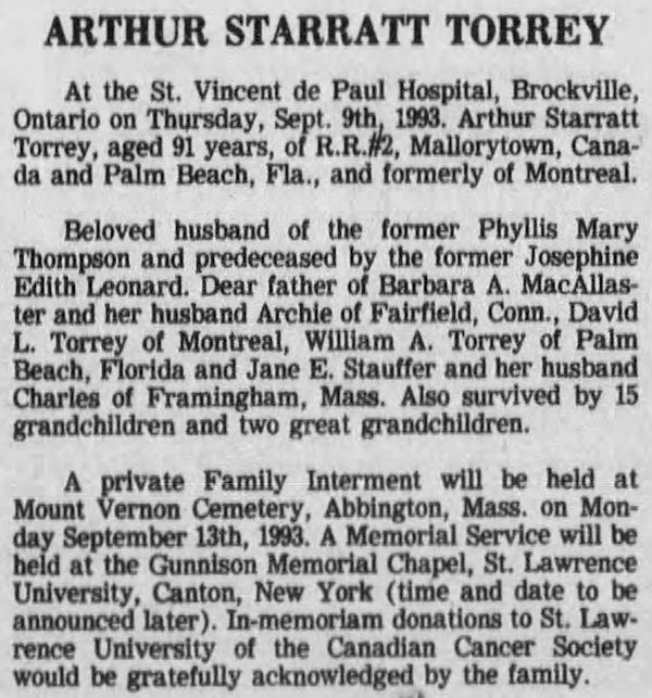 Parents Father: TORREY, George Winthrop Mother: STARRATT, Jennie Francellia Birth Born on February 21, 1902 in Rockland, Plymouth Co., MA Death Died on September 09, 1993 in Brockville, Leeds And Grenville Co., ON Buried in Mount Vernon Cemetery in Abington, Plymouth Co., MA Marriages LEONARD, Josephine Edith Married on August 21, 1926 in Gouverneur, St. Lawrence Co., NY Children TORREY, David L. TORREY, Barbara Ann: May 17, 1929 - October 12, 2016 TORREY, William A.: 1934 TORREY, Jane E.: November 15, 1940 Notes Occupation: Economist Sources Findagrave.com: https://www.findagrave.com/memorial/201803258/arthur-starratt-torrey Images Arthur Torrey Birth Arthur Torrey Arthur Starratt Marriage Arthur Torrey Obit The Palm Beach Post Sep 12,1993 Arthur Torrey Obit The Palm Beach Post September 17,1993 Arthur Torrey