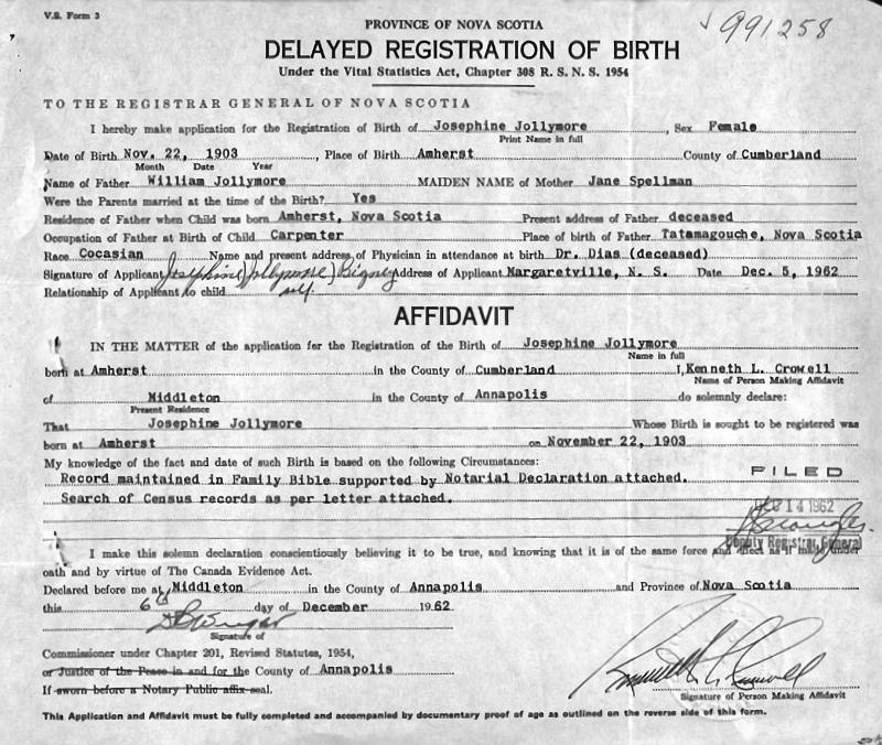 Parents Father: JOLLYMORE, William John Mother: SPELLMAN, Phoebe Jane Birth Born on November 22, 1903 in Amherst, Cumberland Co., NS Death Died on 1983 in McAdam, York Co., NB Buried in Church Grove Cemetery in Melvern Square, Annapolis Co., NS Marriages BIGNEY, George Herbert Married on November 19, 1923 in Kentville, Kings Co., NS , Children JOLLYMORE, Belford Gardner: February 25, 1922 Notes Obituary: Margaretsville - Bigney, Mrs. Josephine, 79, Margaretsville, died Monday in MacLean Memorial Hospital, McAdam, N. B. Born in Amherst, she was a daughter of the late John and Jane (Spellman) Jollimore. She is survived by a son, B. Gardner Jollimore, McAdam; a sister, Mrs. Viola Negus, Amherst; and one grandson. She was predeceased by husband, George; and two sisters, Roxy and Retta. The body is in Warren T. Roop Funeral Home, Middleton. Funeral will be 2 p.m. Thursday in Evergreen Baptist Church, East Margaretsville, Pastor Rick Berry officiating, with burial in Church Grove Cemetery, Melbourne Square. Chronicle Herald Halifax,NS October 4,1983 Sources Halifax Herald: Obituary October 4,1983 Images Josephine Jollymore Birth Josephine (Jollymore) Bigney & Belford Jollymore& Viola (Jollymore) Negus Phoebe Jane Spellman Marriage Josephine Jollymore Marriage