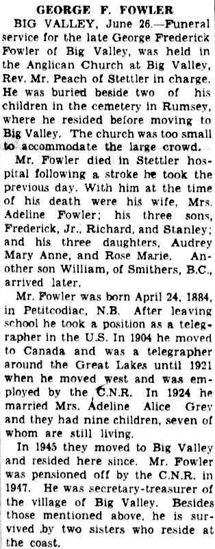 Parents Father: FOWLER, George Frederick Mother: PRICE, Annie Laurie Birth Born on April 25, 1882 in Petitcodiac, Westmorland Co., NB Death Died on June 17, 1951 in Stettler, Stettler Co., AB Buried in Rumsey Cemetery in Rumsey, Starland Co., AB Marriages GRAY, Adeline Alice (Kahandawes) Married on 1924 in Alberta, Canada Children FOWLER, Mary Anne FOWLER, Rose Marie FOWLER, William Frederick: February 24, 1925 - February 27, 2019 FOWLER, George Frederick: March 24, 1926 - November 02, 2017 FOWLER, Audrey Adeline: November 13, 1928 - January 14, 2014 FOWLER, Richard Sherwood: April 12, 1932 - July 08, 2012 FOWLER, Dorothy Mae: May 18, 1935 - March 29, 1936 FOWLER, James Edward: November 16, 1941 - August 19, 1947 FOWLER, Stanley Gilbert: November 12, 1943 - January 06, 2012 Notes Occupation: Telegrapher/ Employee at CN Rail/ Sercretary-Treasurer Village of Big Valley Death: Stroke Sources Cemetery: Rumsey Cemetery Rumsey,AB Images George F. Fowler Jr Birth George Jr & Adeline (Gray) Fowler George Fowler Jr Obit The Calgary Albertan Calgary, AB June 27,1951