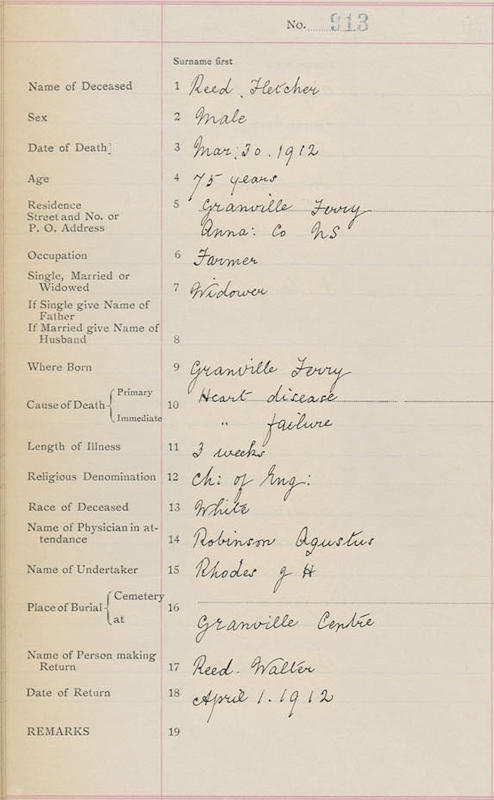 Parents Father: REED, John Edwin Mother: BATH, Kezia Ann Birth Born on December 25, 1837 in Granville Ferry, Annapolis Co., NS Death Died on March 30, 1912 in Granville Ferry, Annapolis Co., NS Buried in All Saints Anglican Cemetery in Granville Centre, Annapolis Co., NS Marriages WILLETT, Mary Adelia Married on July 04, 1861 in Granville, Annapolis Co., NS Children REED, Anne Rebecca: July 10, 1862 - October 23, 1943 REED, Walter Edward: March 29, 1865 - May 17, 1917 REED, Harry Fletcher: February 06, 1868 - January 05, 1933 Notes Occupation: Farmer Death: Heart Disease Sources Nova Scotia Deaths: Book 1 Pg. 153 #913 Images Fletcher Reed Fletcher Reed Death Mary Willett Marriage