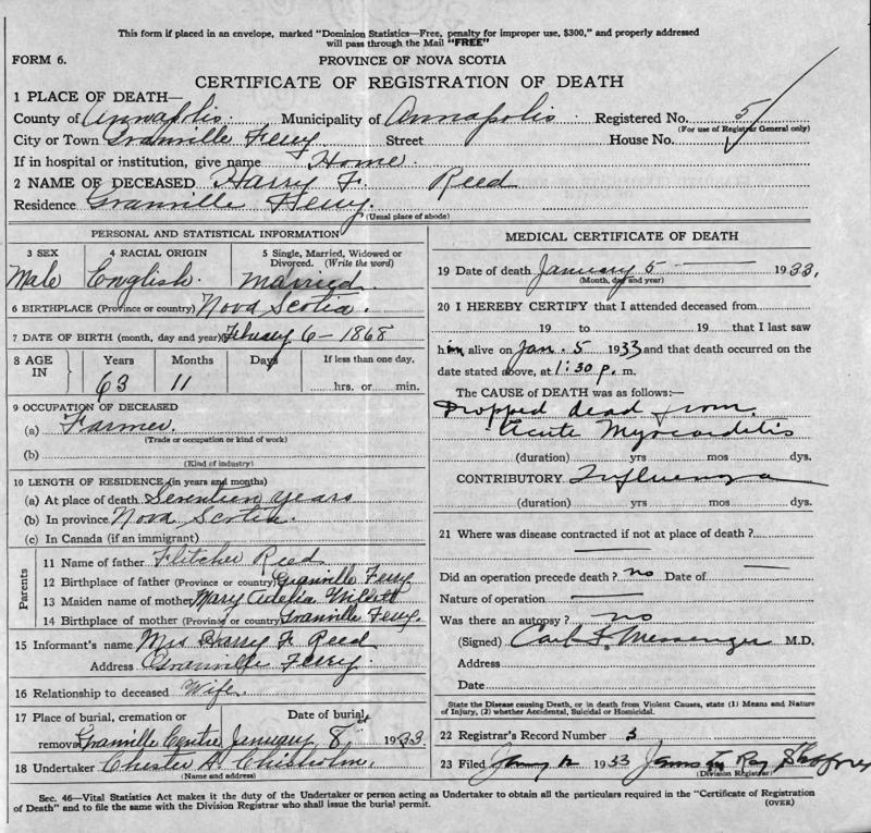 Parents Father: REED, Fletcher Dela Mother: WILLETT, Mary Adelia Birth Born on February 06, 1868 in Granville Ferry, Annapolis Co., NS Death Died on January 05, 1933 in Granville Ferry, Annapolis Co., NS Buried in All Saints Anglican Cemetery in Granville Centre, Annapolis Co., NS Marriages BERRYMAN, Nellie Married on 1900 in Dorchester, Suffolk Co., MA Children REED, Robert Fletcher: 1902 REED, James Willett: May 22, 1905 - May 09, 1981 Notes Occupation: Farmer/ Merchant Death: Acute Myocarditis Obituary: Granville Ferry lost one of its best and most highly esteemed citizens on Thursday last in the sudden passing of Harry F Reed. He dropped dead as he was leaving the barn and was found by his wife. Death was due to a heart attack. Harry Fletcher Reed was the son of Fletcher and Adelia (Willet) Reed of Granville Ferry. He was born 65 years ago in the house in which he and Mrs Reed had made their home during the past 14 or 15 years. When a young man he went to the United States. Thirty two years ago he married at Dorchester, Mass, Miss Nelly Berryman, a native of England, who had come in childhood with her parents to Canada, where she received her education in Dramatic Art which she afterward taught in the Toronto Conservatory of Music and Havergal Ladies College, Toronto. Mr Reed was in business in the United States until his return to Granville Ferry with Mrs Reed and their 2 sons from Eastport, Maine 18 years ago on the death of his uncle Walter Willet, whose home he inherited and which he sold a few years later to Mr and Mrs Minard Bent. He and his brother the late Walter Reed carried on their uncle's business as general merchants until his brother's death after which he carried on the business alone. Mr Reed was the Chapel Warden of Holy Trinity Church and the Superintendent of the Sunday School. He leaves his wife, 2 sons: Robert who is an electrical engineer of Danvers, Mass., and James who is with the Raymond Whitcomb Tourist Agency in Chicago, and one sister Annie, Mrs Henry Hackerley of Halifax. The funeral was held on Sunday afternoon, Reverend RTB Anderson officiating, with the address being given by Rt Reverend John Hackenley, Co-Adjutor Bishop. Interment was in All Saint's Churchyard, Granville Centre. Annapolis Spectator Annapolis Royal,NS January 12,1933 Sources Nova Scotia Deaths: Book 138 Pg. 5 Annapolis Cemetery Records: Granville Centre # 9 Images Harry & Nellie (Berryman) Reed Harry Reed Death