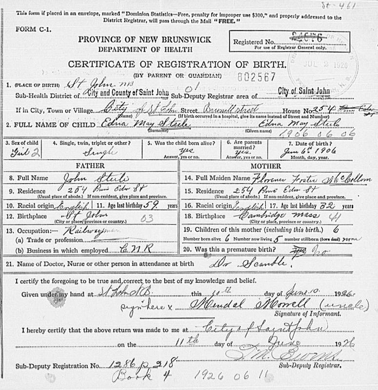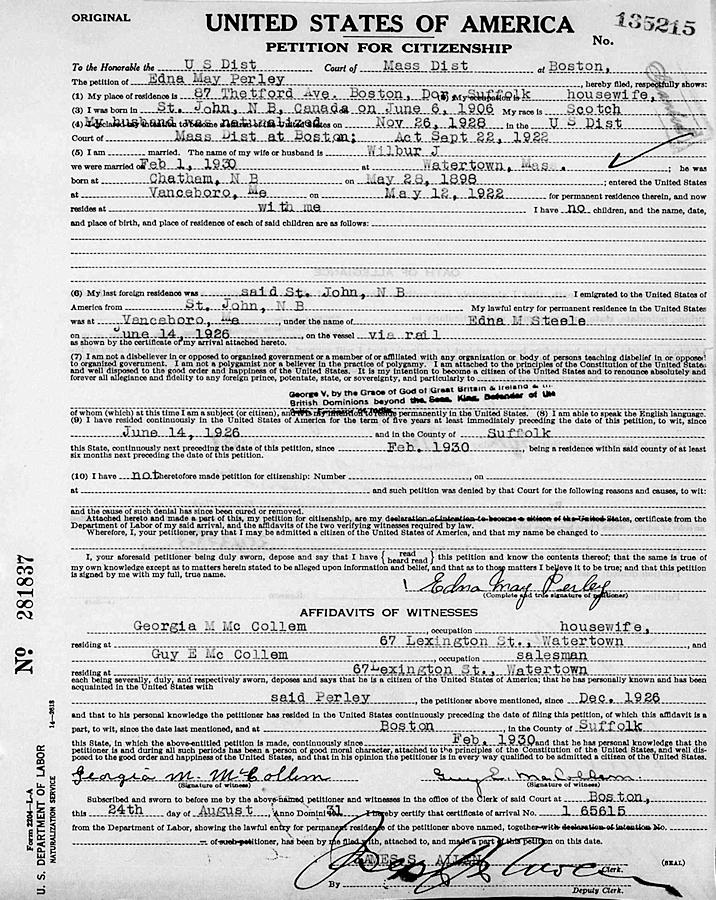 Parents Father: STEELE, John Miller Mother: McCOLLOM, Florence Foster Birth Born on June 06, 1906 in Saint John, Saint John Co., NB Death Died on June 16, 1993 in Canton, Norfolk Co., MA Buried in Ridgelawn Cemetery in Watertown, Middlesex Co., MA Marriages PERLEY, Wilbur James Married on February 01, 1930 in Watertown, Middlesex Co., MA Children PERLEY, Dorothy A.: December 18, 1935 - January 17, 2021 PERLEY, Ruth F.: February 17, 1942 Sources Massachusetts Deaths: #036462 Images Edna Steele Birth Wilbur & Edna (Steele) Perley Edna Steele Naturalization