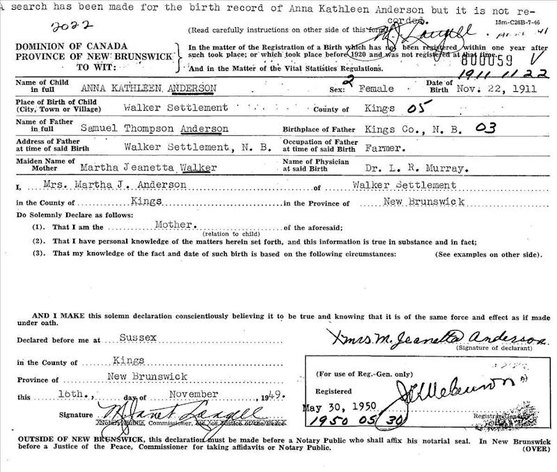 Birth Born on November 22, 1911 in Walker Settlement, Kings Co., NB Death Died on 1988 in Saint John, Saint John Co., NB Buried in Fernhill Cemetery in Saint John, Saint John Co., NB Marriages STEELE, Ernest James Frederick Married on October 19, 1940 in Saint John, Saint John Co., NB Children STEELE, Ernest T.: October 25, 1945 - October 25, 1945 Notes Occupation: Waitress Sources Billiongraves: https://billiongraves.com/grave/A-Kathleen-Steele/25188522 Images Anna Anderson Birth Ernest Steele Marriage