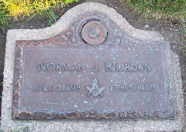 Birth Born on April 30, 1898 in St. Marys, Perth Co., ON Death Died on February 06, 1956 in Windsor, Essex Co., ON Buried in Victoria Memorial Gardens in Oldcastle, Essex Co., ON Marriages GILLIATT, Helen Valborg Married on September 17, 1919 in Toronto, ON Notes Occupation: Lawyer Obituary: Norman J. Riordan, aged 57 at Windsor on Feb 6 husband of Katharine M. (White) father of Robert John and Elizabeth Anne 1 brother William 3 sisters Mrs Victor Sgarglia; Mrs Edward Lang; Mrs William Lindsay The Windsor Star Windsor,ON February 08,1956 Sources Newspaper Obituary: The Windsor Star Windsor,ON Obituary February 08,1956 Images Norman Riordan Birth Norman Riordan Birth Norman Riordan Helen Gilliatt Marriage2