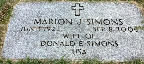 Birth Born on June 01, 1924 in Corinth, Penobscot Co., ME Death Died on September 08, 2006 in Bangor, Penobscot Co., ME Buried in Maine Veterans Memorial Cemetery in Augusta, Kennebec Co., ME Marriages SIMONS, Donald E. Married on November 08, 1952 in Maine, USA Notes Obituary: Marion J. Simons, 82, wife of the late Donald E. Simons, died Sept. 8, 2006, at a Bangor hospital. She was born June 1, 1924, in Corinth, the daughter of Justin L. and Verus K. (Aitken) Chapman. Marion was a 1941 graduate of Hampden Academy and a 1942 graduate of Beals Business College. She was employed as an office worker at the shipyard in South Portland during World War II and later worked as a bookkeeper for Miller's Restaurant, Bangor, where she worked for many years. Marion enjoyed bowling and was a 35-year player in the WIBC Championship Tournaments. Surviving are two sisters, Elsie DeWitt of Hudson and Norma Hatch and her husband, Glen, of Kenduskeag; nieces and nephews, Kathy Bourbon and her husband, Tom, of The Villages, Fla., LeRoy DeWitt and his wife, Connie, of Hampden, Estelle Copeland of South Portland, Carroll DeWitt and his wife, Sherrie, of Henderson,Nev., Chester DeWitt of Hudson, Gary Rollins and his wife, Patti, of Kenduskeag, Allen Rollins and his wife, Shirley, of Exeter, Michael Rollins and his wife, Diane, of Corinth, Jeffrey Rollins and his wife, Renee, of Carmel, Barbara Pineo and her husband, Troy, of Corinth; several great-nieces and great-nephews. Burial will be noon Monday at the Maine Veterans' Memorial Cemetery, Civic Center Drive, Augusta. Bangor Daily News Bangor,ME September 2006 Occupation: WW2 Office Worker South Portland Shipyard/ Bookkeeper - Miller's Restaurant Bangor,ME Sources Newspaper Obituary: Bangor Daily News Bangor,ME Obituary September 2006 Images Marion (Chapman) Simons