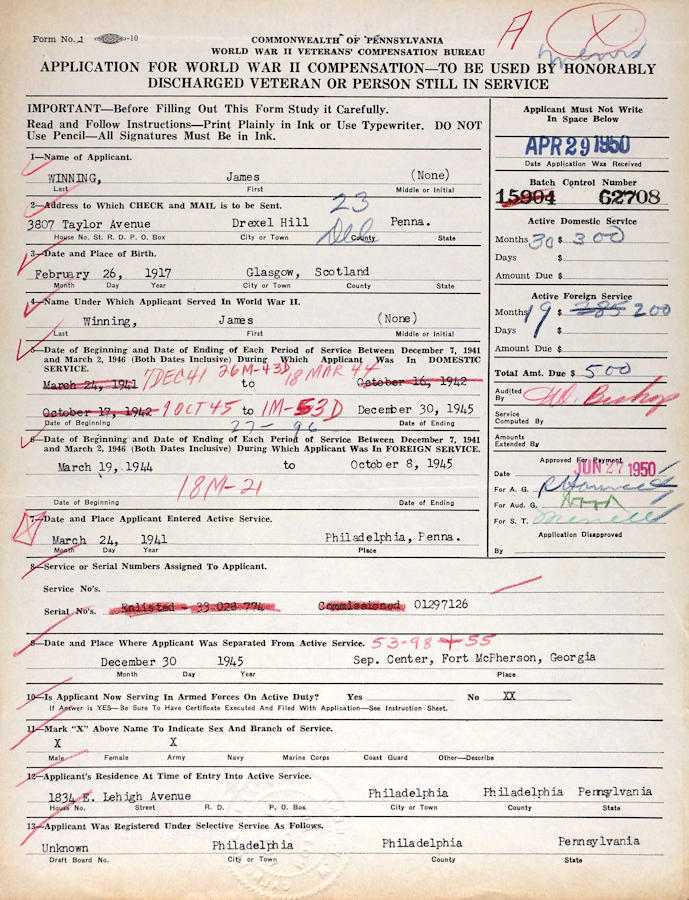 Birth Born on February 26, 1917 in Glasgow, Lanarkshire, Scotland Death Died on May 14, 2008 in Huntsville, Madison Co., AL Buried in Hampton Cove Cemetery in Owens Cross Roads, Madison Co., AL Marriages FOWLER, Cathleen Anna Married on 1943 Children WINNING, Jill Fowler: November 03, 1944 - July 12, 1993 WINNING, Carol: November 03, 1944 Notes Military Service: WW2, Korea US Army Colonel Occupation: Military Strategist Army Missile Command Obituary: Retired Col. James "Jim" Winning, 91, of Huntsville passed away Wednesday. A native of Glasgow, Scotland, Jim arrived in America at age six with a tiny band of Scots, traveling on the Megantic, sister ship of the Titanic. Jim retired in 1972 from his civilian position with the Army Missile Command as a military strategist. He had served with pride in the U.S. Army and Alabama National Guard for over 30 years, commanding the 1169th Engineering Group in his final post, and having fought in distant islands in the Pacific during World War II and in Korea. He often opined that there was no mission that the United States Army could not do. Jim was a leader of men, always upright and honorable, and a beloved husband, father, and grandfather. He was preceded in death by a daughter, Jill Winning, and his parents, Hugh and Anna MacLachlan Winning. Survivors include his wife, Mary Catherine Winning; son, James Clements Winning and wife Lauren of Annapolis, Md.; daughters, Constance Winning Aguda and husband Salvador of Winter Springs, Fla., Stephanie Werdehoff and husband Bill of Huntsville; Carol MacLachlan of Nashville, and Joy Pickett and husband Pete of Athens; and four grandchildren. Images James Winning Military Pension Application James Winning Naturalization