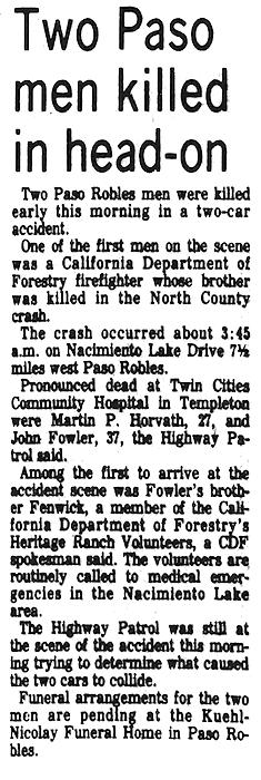 Parents Father: FOWLER, Rulof Hartt Mother: KEANE, Agnes Ruth Birth Born on August 14, 1946 in Manhattan, New York, NY Death Died on October 05, 1983 in San Luis Obispo Co., CA Marriages ROBBINS, Nancy (Gratch) Married on May 29, 1983 in San Luis Obispo Co., CA Notes Military Service: US Navy Death: Automobile Accident Images John Fowler Obit