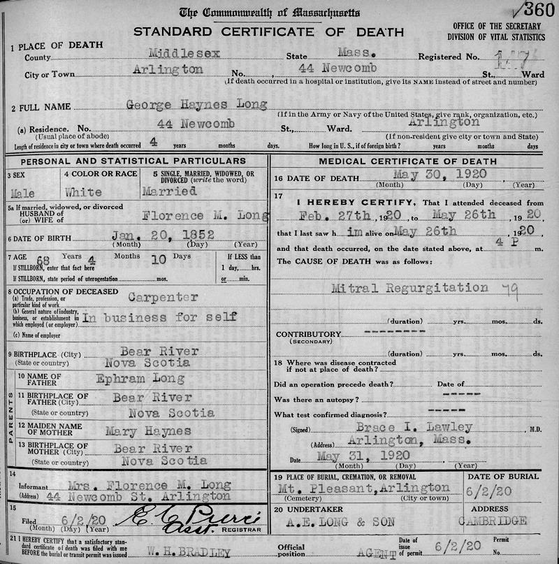 Birth Born on January 20, 1852 in Bear River, Annapolis Co., NS Death Died on May 30, 1920 in Arlington, Middlesex Co., MA Buried in Mount Pleasant Cemetery in Arlington, Middlesex Co., MA Marriages DURLING, Florence May Married on May 10, 1894 in Cambridge, Middlesex Co., MA Children LONG, Adna George: February 24, 1895 - December 25, 1961 LONG, Gladys M.: December 02, 1896 - January 17, 1985 LONG, Harold Martin: May 09, 1899 - February 18, 1956 LONG, Ella: May 10, 1899 LONG, Melvin Freeman: April 25, 1901 - 1966 Notes Occupation: Carpenter Death: Mitral Regurgitation Sources Massachusetts Deaths: Arlington Pg. 360 #147 Images George & Florence (Durland) Long & Harold & Doshie (Wood) Long George Long Death Florence Durling Marriage George Long Obit The Boston Globe Boston,MA Jun 1,1920